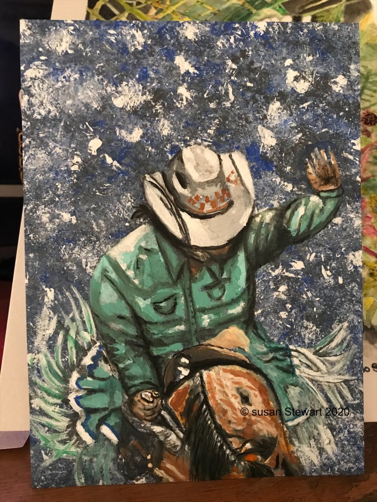 Every year sometime in the summer is a fair. We attend the fair when it’s available. During the fair there is also the rodeo. Most of the time we miss it. But this particular year we were able to attend. I always have my camera on hand for such events. I took tons of photos. This particular photo caught my attention while I was looking for something to add to this project. This cowboy and his horse are actually three different photos in one painting. Can you guess where I was sitting? The rail!