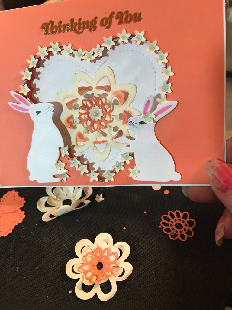The card front and the inside mat are a happy orange color. The pale flowers outlining the heart are cream color paper. Inside each flower is Nuvo drops in blue lagoon. Embossed lettering created with clear embossing powder. Heart cut out is done with a die. Enjoy!